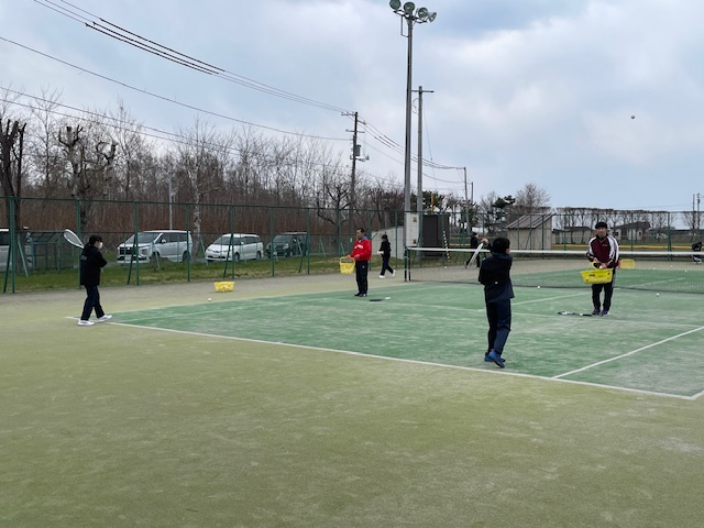 野球場の隣では、伊達中テニス部が練習をしていました。先週雨のため、予定されていた北電コートでの練習が中止となり、今シーズン初めての北電コートでの練習となりました。丸山さんや合田さんをはじめ、4人の地域指導者の方々が指導に当たってくれ、1年生は1年生で、別メニューを組み、5/5(月)の大会に向け、練習を行っていました。