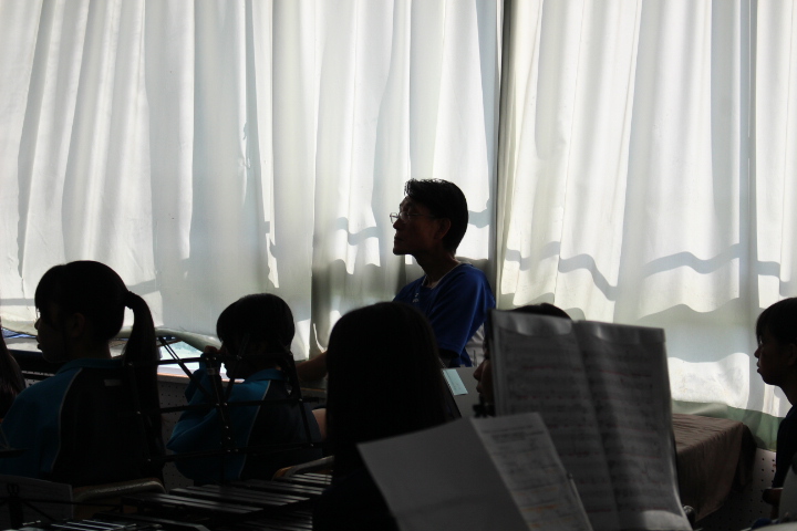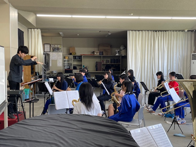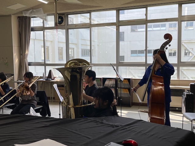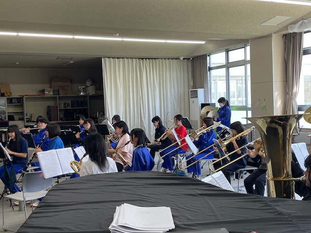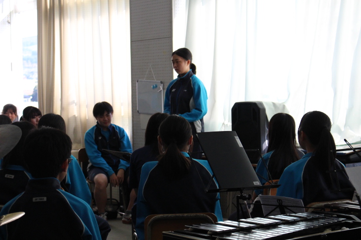 この日も天候に恵まれ好天でしたが、昨日大会等もあり市内の学校施設では、活動している様子はあまり見ることが出来ませんでした。午前の光陵中では、体育館での活動がなく、一度光陵中を離れたのですが、もしかして吹奏楽が活動しているかもしれないと思い直して、体育館ではなく生徒玄関に向かうと、校舎内に入ることが出来たので、音楽室に向かってみると予想通り吹奏楽部が、合奏練習をしていました。