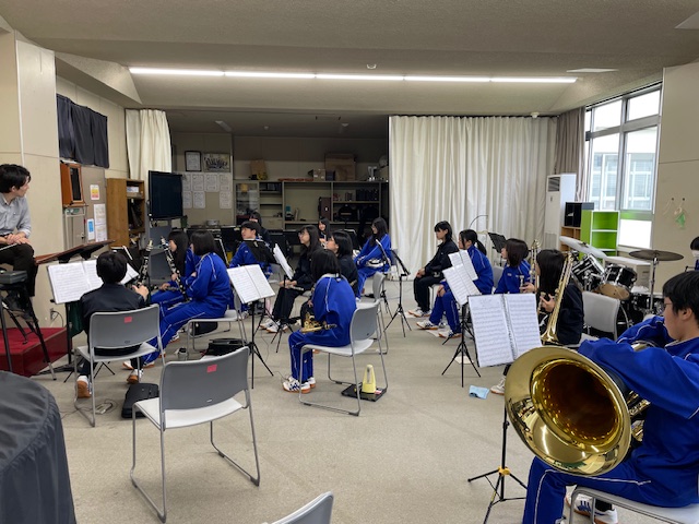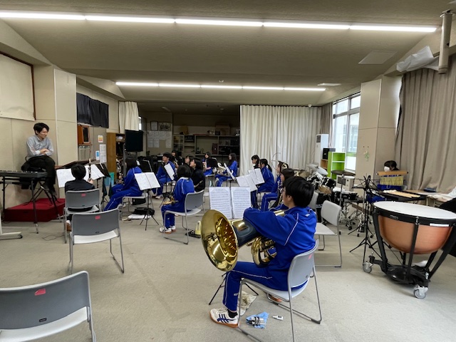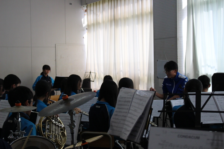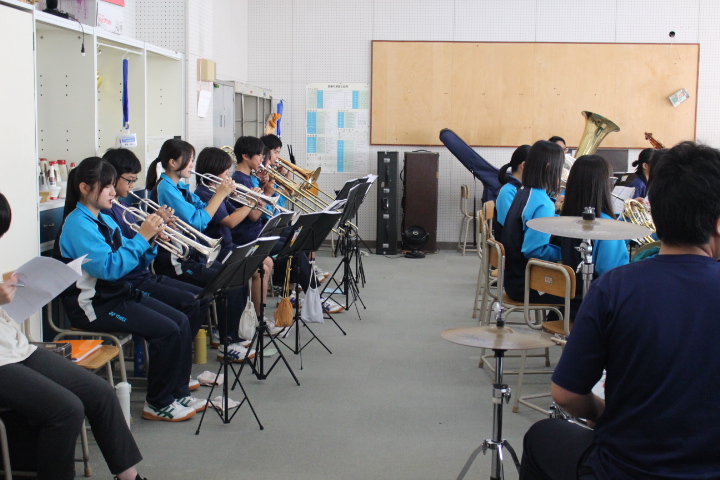 午前の光陵中では、小雨が降っていたこともあり、野球部が来週の大会に向けて体育館で練習をしていました。音楽室では、吹奏楽部が上埜先生とこの日も色々と協議をしながら、合奏練習をしていました。