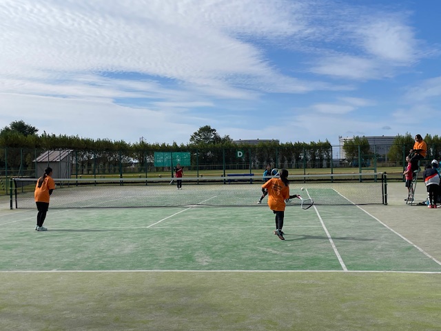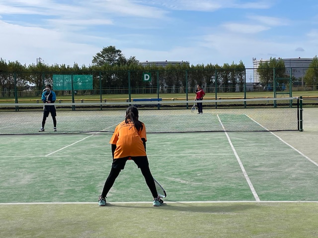 テニスコートでは、ジュニアの大会が行われていましたが、端のコートで、伊達中テニス部のメンバーが、他地区の生徒と交流会試合をしていました。