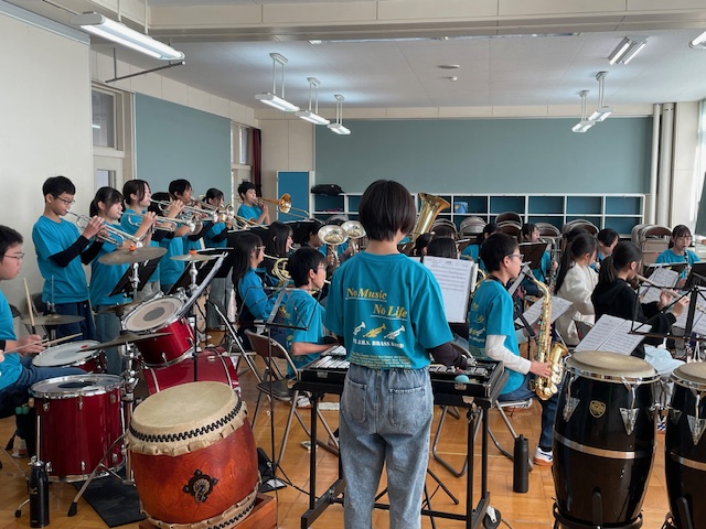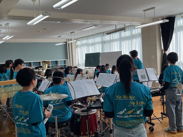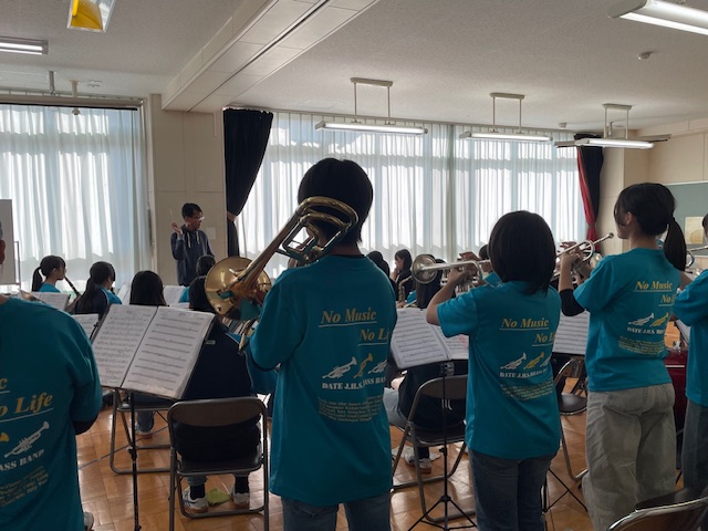 伊達中に向かってみると、グラウンドも体育館も誰もいなく、今日は練習がないのかな?と思っていると、吹奏楽の演奏が聞こえたので、校舎内に入ってみると、1階の多目的室で合奏の練習をしていました。