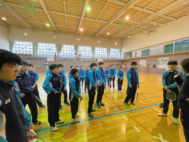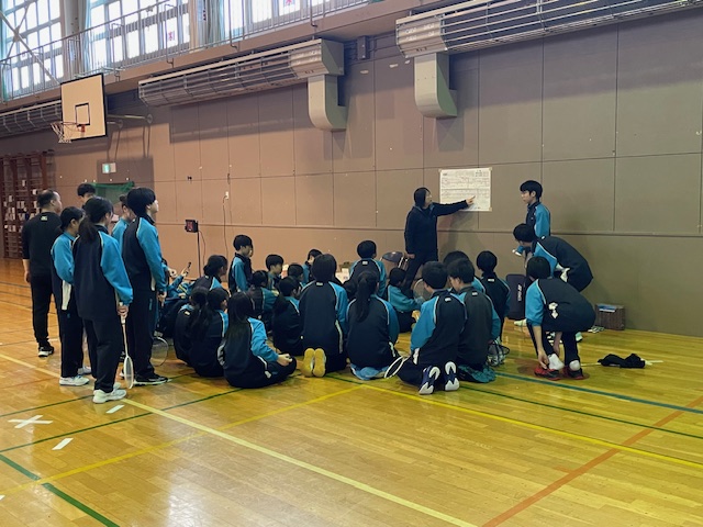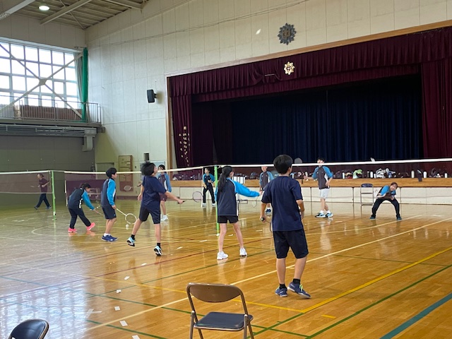 午後は、本格的に雨が降り、屋外での活動はできない状況でした。伊達中の体育館だけが照明がついていて、体育館の中に入ってみると、バド部が来週から始まる新人戦に向けて練習をしていました。