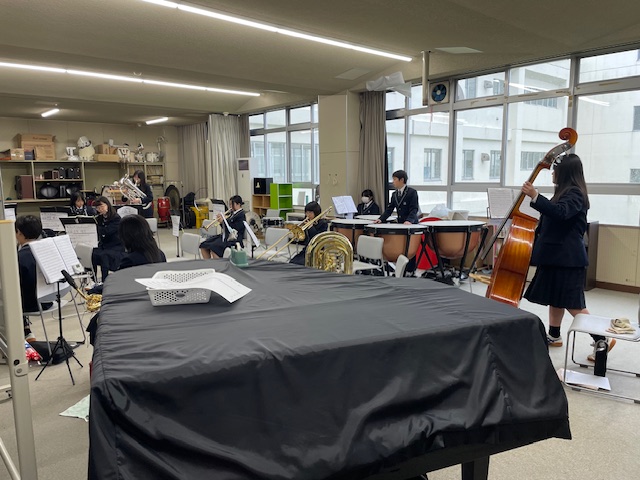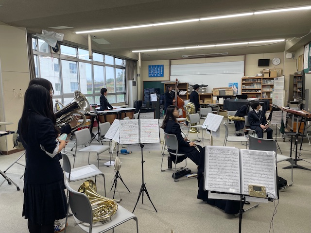 午後は、光陵中学校の体育館では、翌日の大会に向けて、光陵中と伊達中の生徒が練習に取り組んでいました。斎藤先生から、「光陵で練習できますよ!」という連絡が、大会中止後生徒の方に連絡が入り、体育館に行ってみると、光陵中の生徒と同じ人数、伊達中の生徒が来ていました。大会にかける生徒たちの思いを感じるとともに、2年以上合同練習に取り組んできた成果も感じたところでした。音楽室では、吹奏楽部が外部指導者の方を招いて、合奏練習をするそうで、音楽室で準備をしている最中にお邪魔させてもらいました。