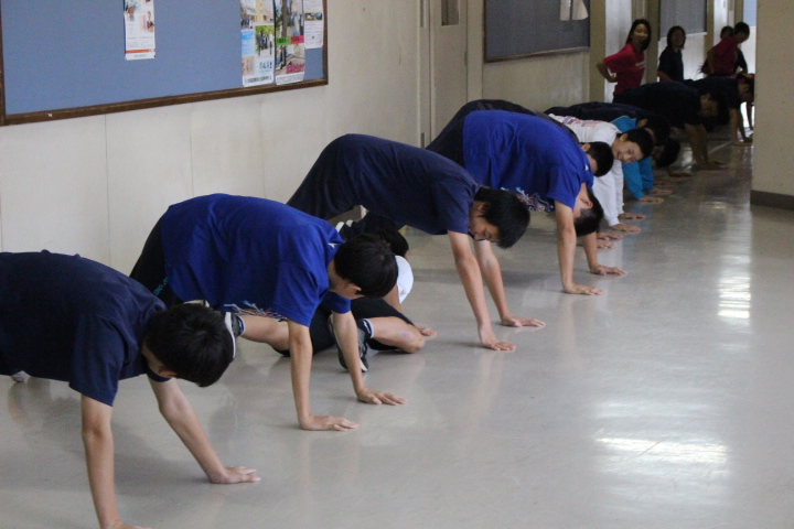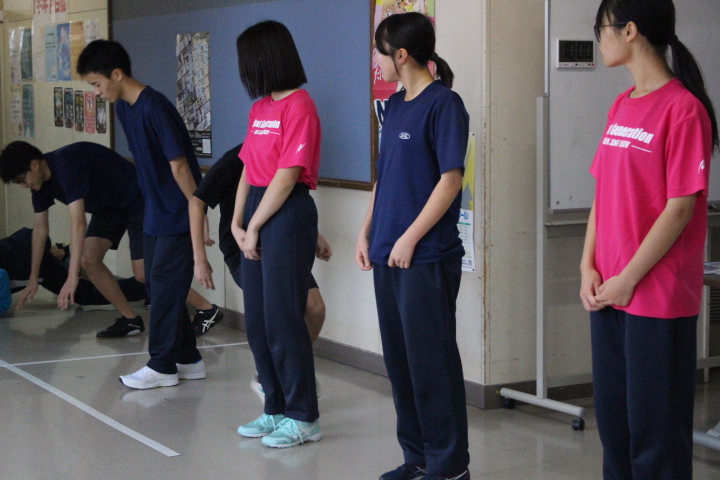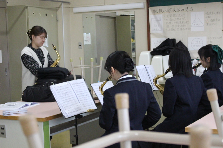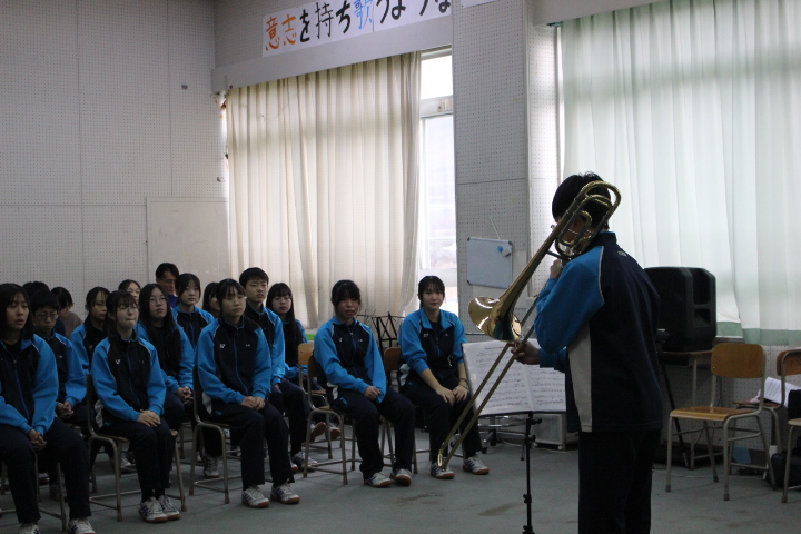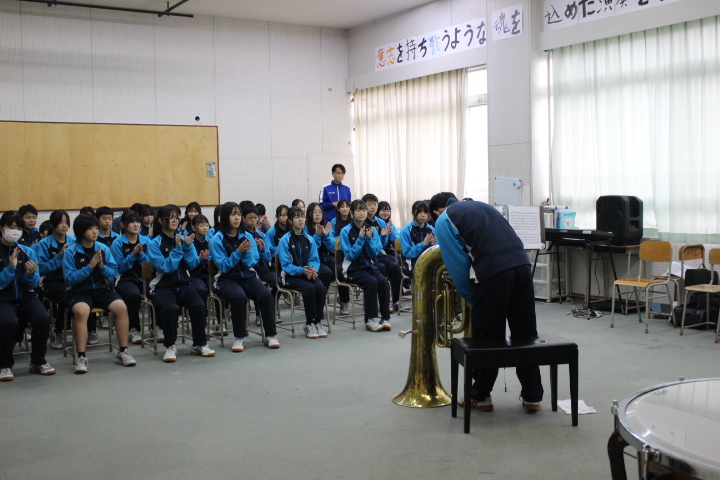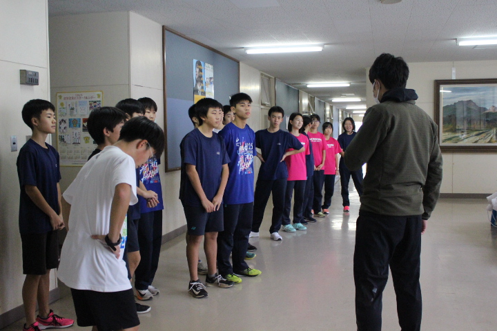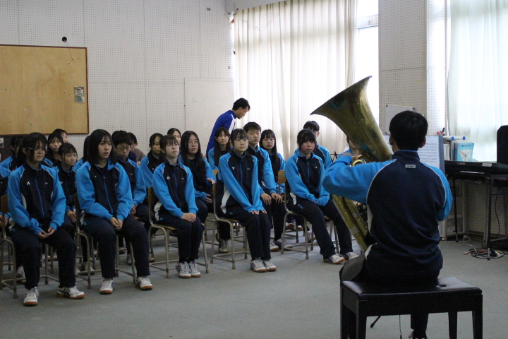 光陵中体育館に向かうと、バレー部が伊達中同様、次週の大会に向け、八丁平のクラブチームを招いて、練習試合を行っていました。音楽室では、この日諏訪講師を招いて、ソロアンサンブルコンクールに向け、演奏を聴いてアドバイスをもらっていました。多目的室では、山本コーチの指導のもと、陸上部のオフシーズントレーニングが行われていました。