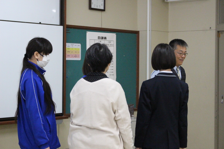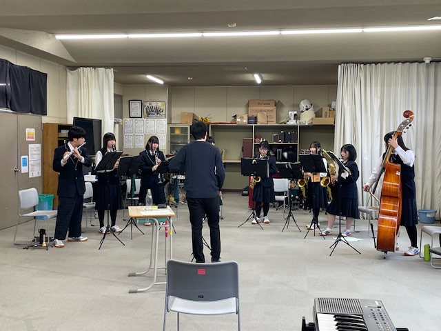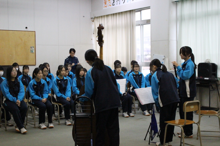 午後、光陵中の体育館では、野球部が練習をしていました。入部予定の小6児童も6人ほど練習に参加していました。午前中吹奏楽を取材できなかったので、音楽室に行ってみると、この日は発表会だったようで、上埜先生に聴いてもらって、全体や細かい部分のアドバイスを受けているようでした。