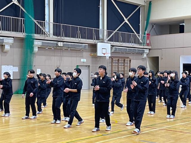 最初は、音楽に乗りながら、簡単なステップで動く動作から、だんだんとステップが難しくなり、手の動きも複雑になっていきましたが、光陵中の1年生は、じわじわと汗をかきながらも、熱心に踊ってくれました。