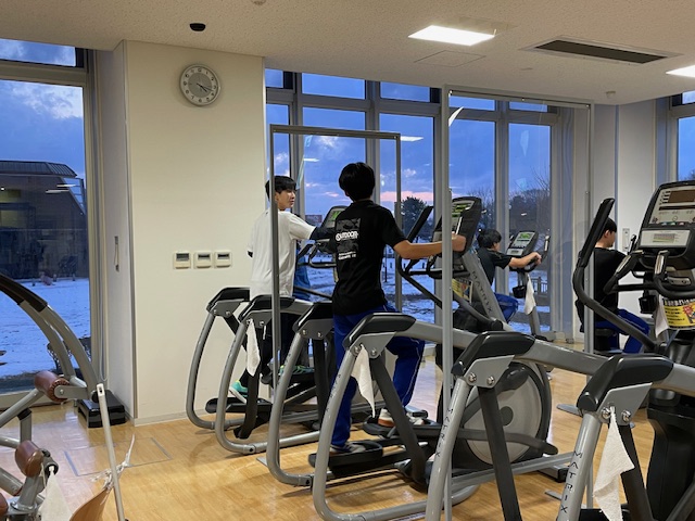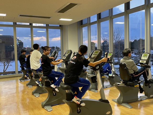 光陵中陸上部の恒例の、オフシーズンのトレーニングルームを活用した練習が始まりました。毎週火曜日、合同練習で総合体育館に来るバレー部と一緒にスクールバスに乗って、体育館のトレーニング室で練習を行います。この日は今シーズン初日ということもあり、7名全員と村瀬コーチ、鳥海先生も参加していました。