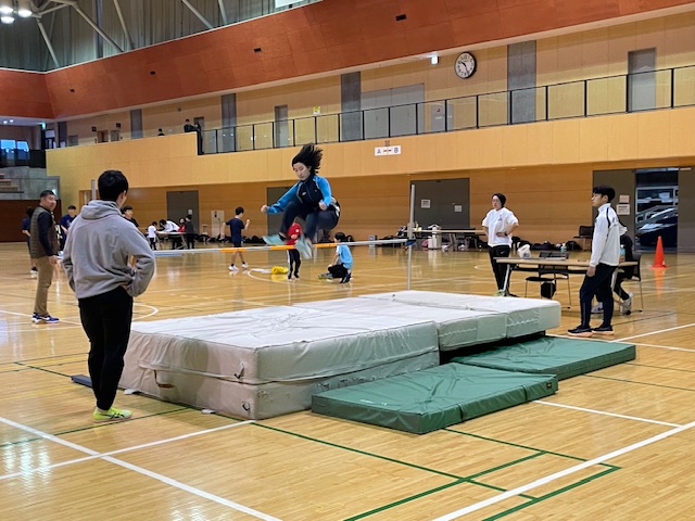 前半は、立ち幅跳びや砲丸投げ、走高跳等のフィールド競技中心の記録会となりましたが、多くの生徒が参加し、オンシーズンでは体験できない競技に、楽しんで参加していました。