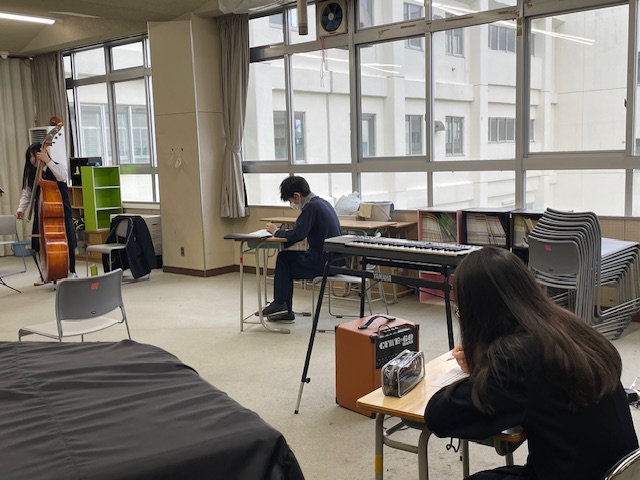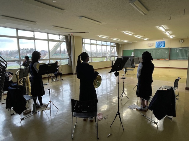 午前中の伊達中体育館では、テニス部が活動をしていました。音楽室に行くと、吹奏楽部がソロアンサンブルコンクールに向け、出場者の演奏会を行っていました。