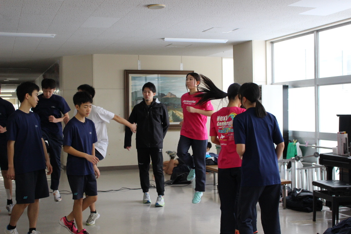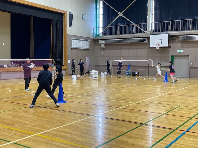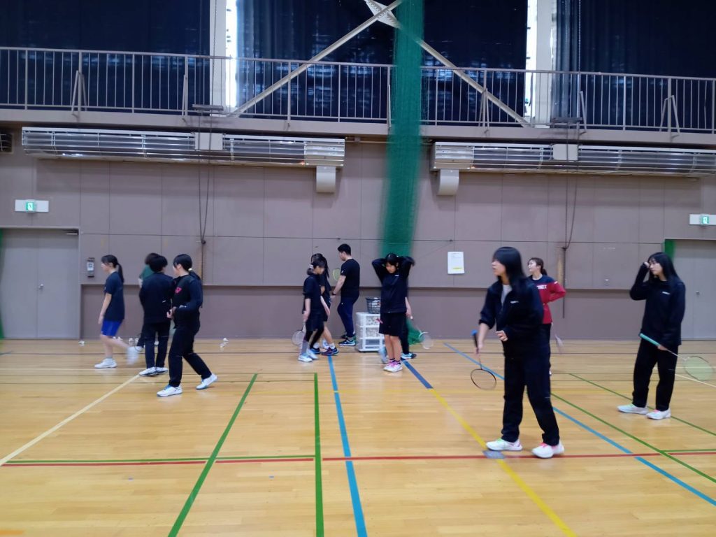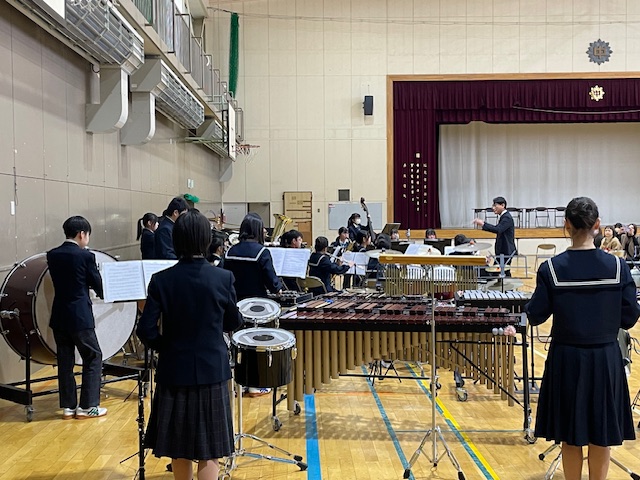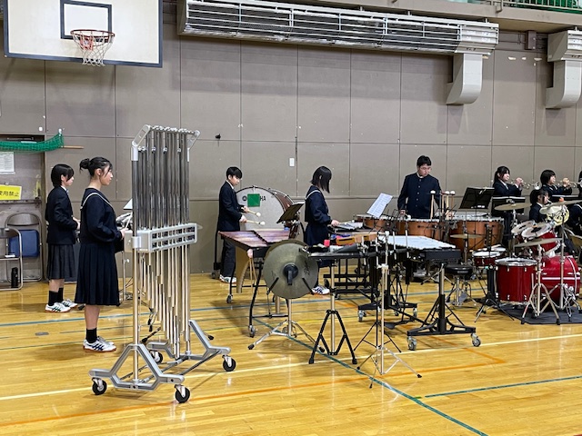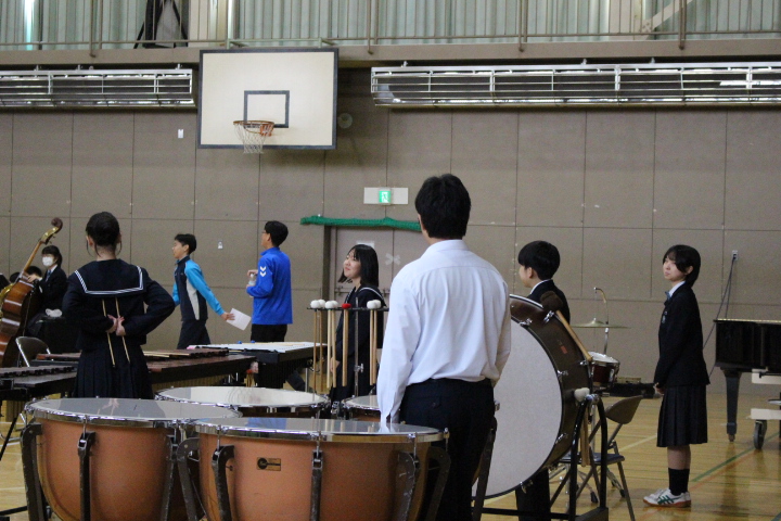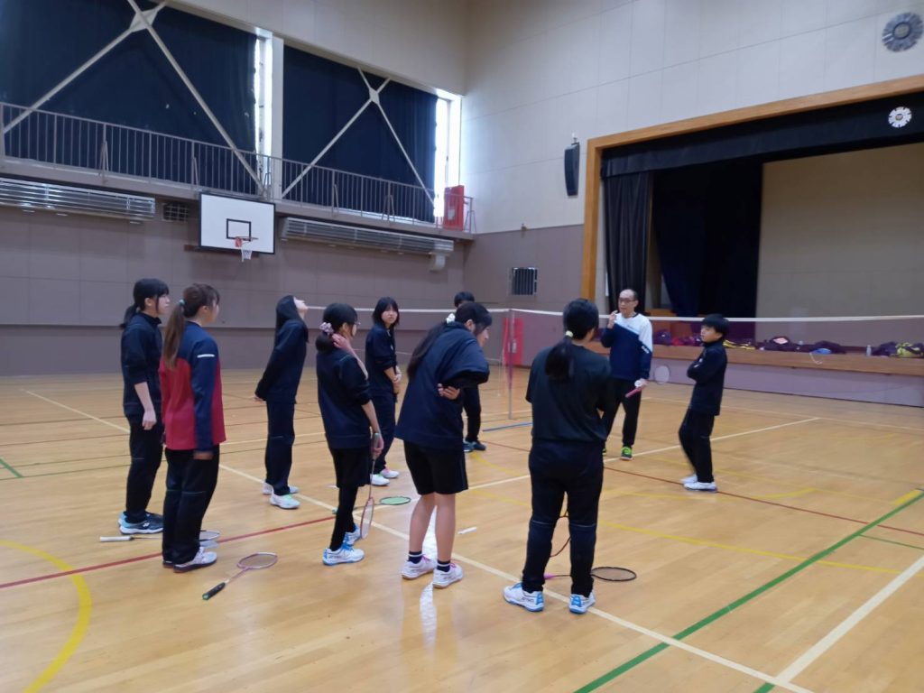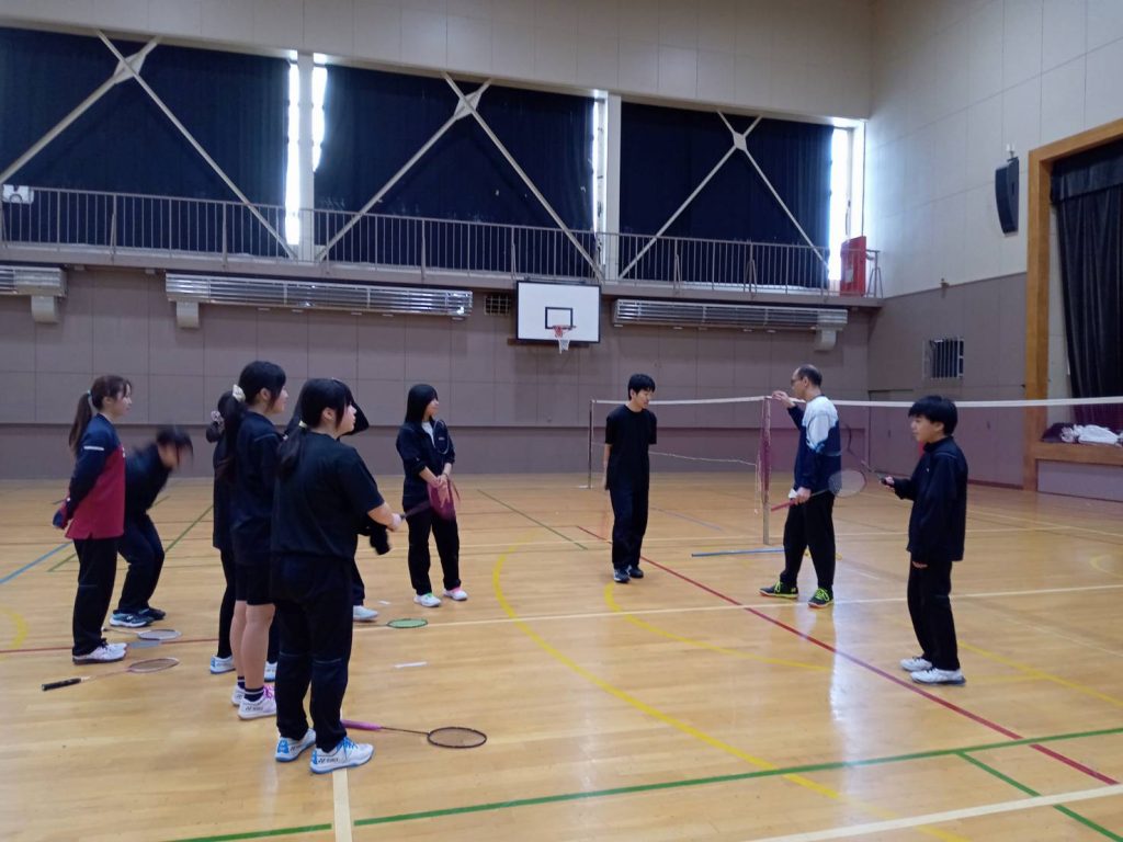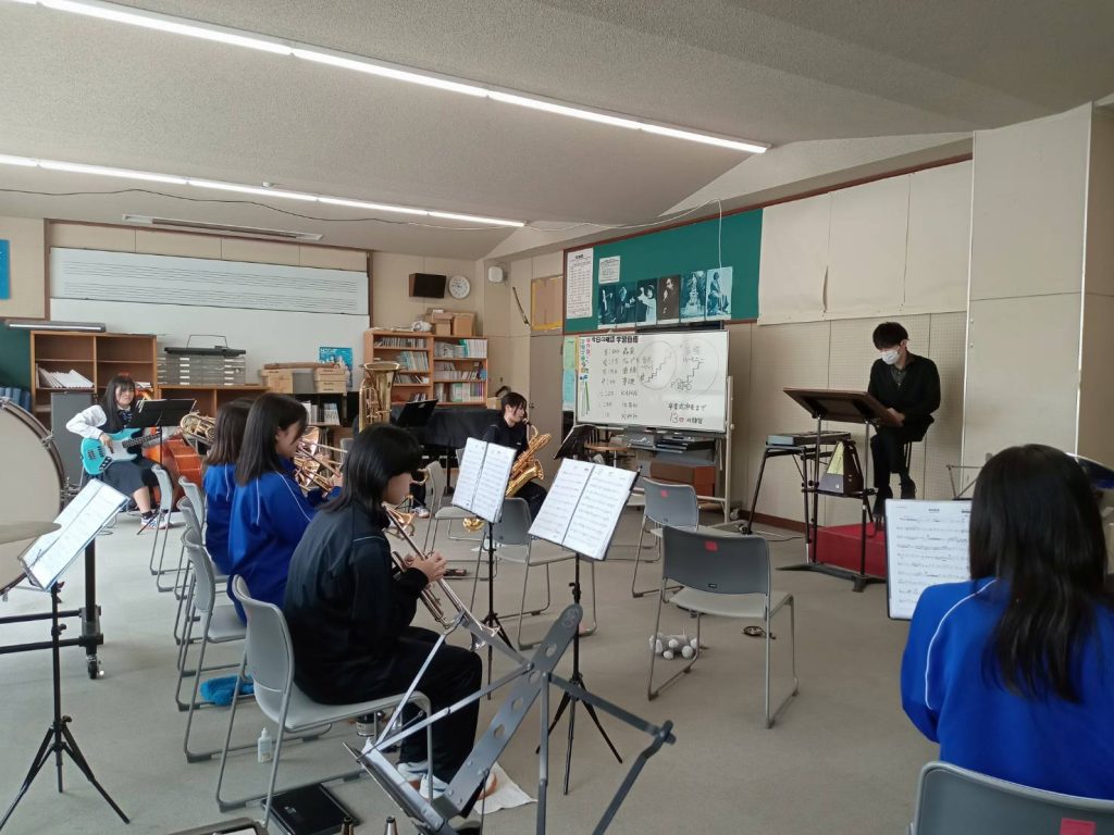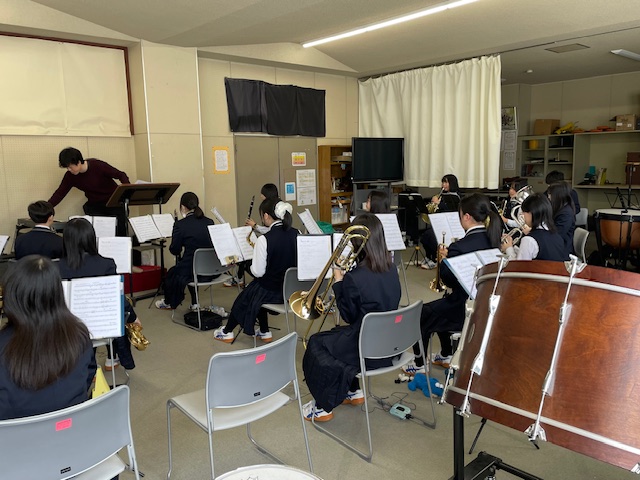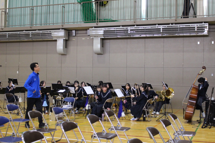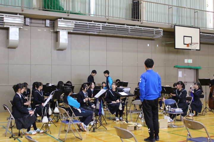 光陵中に行ってみると体育館ではバドミントン部が練習をしていました。音楽室では、吹奏楽部が外部の指導者が指揮をして合奏を行なっていました。