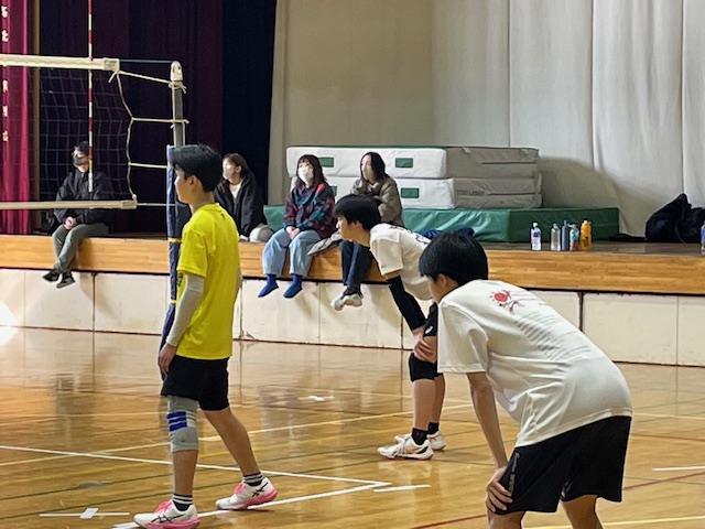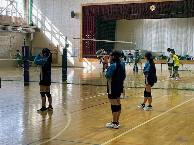 最初に伊達中体育館に行くと、バレー部が練習をしていました。この日は松下先生が練習を見ていて、AB戦のゲームをしていました。隣では、胆振選抜の男子チームが練習をしていて、白山くんががんばって練習をしていました。
