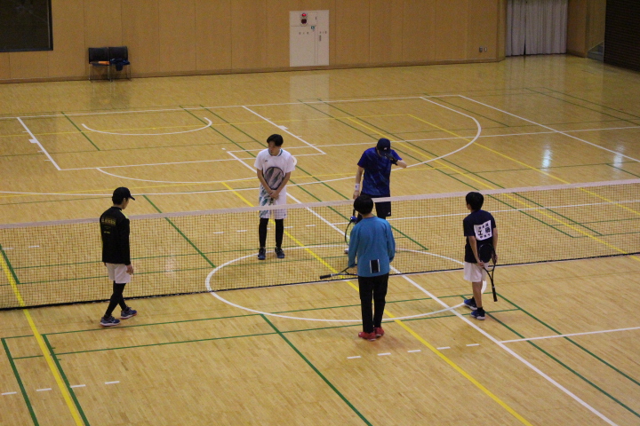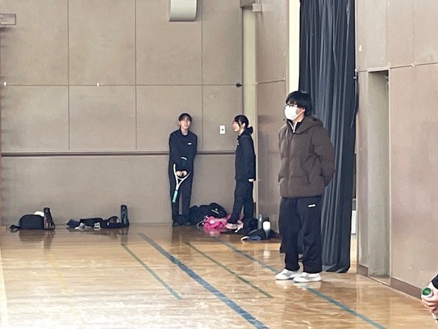 伊達中に行くと、やはりたくさん車が止まっていて、札幌や倶知安など3チームが来校し練習試合を行っていました。伊達中も昨日に比べ暖かいかったので、光陵同様、保護者も選手も寒さに固まることなく、試合や観戦をしていました。体育館では、テニス部が大会に参加していない男子と女子が、地域指導者の方に試合形式の練習で指導を受けていました。