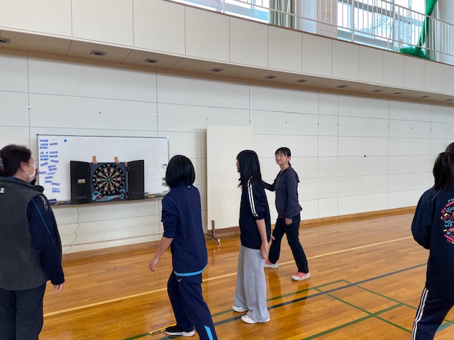 9年生(中3)の卒業式後の開催となってしまったため、5年生から8年生10名での実施でしたが、先生方もたくさん参加していただいて、ダーツ、吹き矢、トリコロキューブの3種目のニュースポーツの挑戦してもらいました。